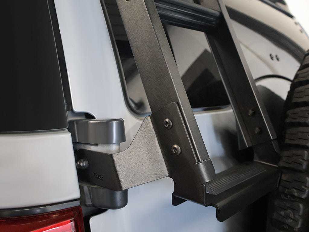 A three (3) step ladder for the rear hatch of the Toyota FJ Cruiser to access the cargo or sporting gear on your rack. The top of the ladder hooks over the top of the tail gate and fixes to the OEM spare wheel bracket mounting points, no drilling or vehicle modification required. Contains rubbers grips on the top and bottom steps. Made with off-road tough black powder-coated high-strength steel and aluminum for maximum durability and strength. Fitment guide and installation hardware included. Note: The rear hatch window is not operational when this ladder is installed.