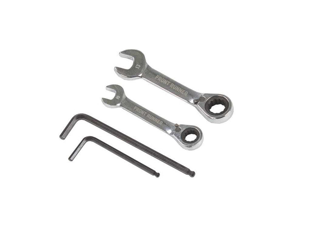 The Front Runner 4 piece tool kit is all you need for moving around rack accessories, reconfiguring Slimline II Roof Rack slats, and general Front Runner accessory adjustments. This high quality kit is compact and can be stored within easy reach.Includes the following: 1 x 5mm Ball type Hex Key 1 x 4mm Ball type Hex Key 1 x 10mm Ratchet Wrench Tool 1 x 13mm Ratchet Wrench Tool