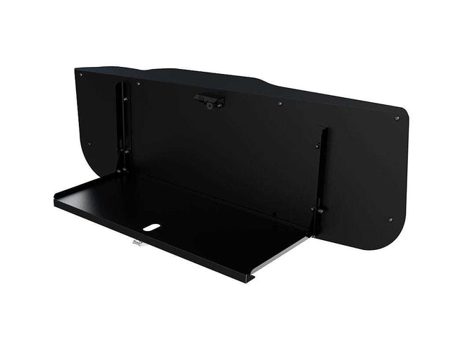 A Drop Down Table specifically tailored to create a flat surface to fit the rear swing door of the Suzuki Jimny. Suitable for the 3 door and 5 door models. It features a large working surface of 615mm/24.2'' W x 257mm/10.1'' L, perfect for small cooking appliances, kettle/coffee station. Stores neatly at 64mm/2.5'' when closed. The Suzuki Jimny Drop Down Table lowers to open at 90 degrees from the mounted base. The table latch features a hole to securely lock the table in place, RRAC134 can be used. *Sold Separately   Table maximum load: 20Kg (44.1lbs). The included VACC152 mounts to the Suzuki Jimny's tail gate by removing the OEM plastic trim/door card, providing the flat surface attach the Drop Down Table. Drilling is required for installation. Installation hardware and fitment guide included. Note: Not compatible with Jimny models with a manual internal tail gate lock.