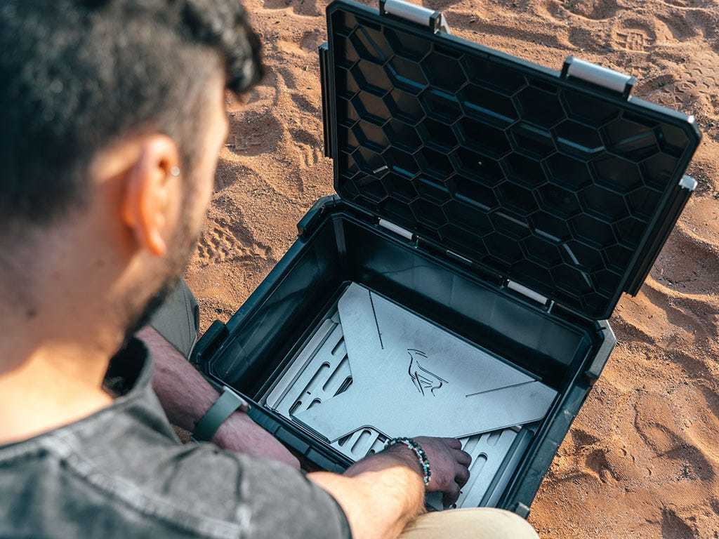 This kits contains the VACC087 and the SBOX031. A BBQ/Fire Pit that is designed to pack flat at 1.5 inches / 38mm thick. Features a large grill surface area. Sturdy base for safe grilling. Quick and easy 30-second setup. Sides of grill serve as a wind-break. Safely contains your fire and keeps the fire elevated off the ground. Constructed from high strength steel, providing high rust and corrosion resistance. Supplied with gird lifting tools. Stores neatly in the included SBOX031.